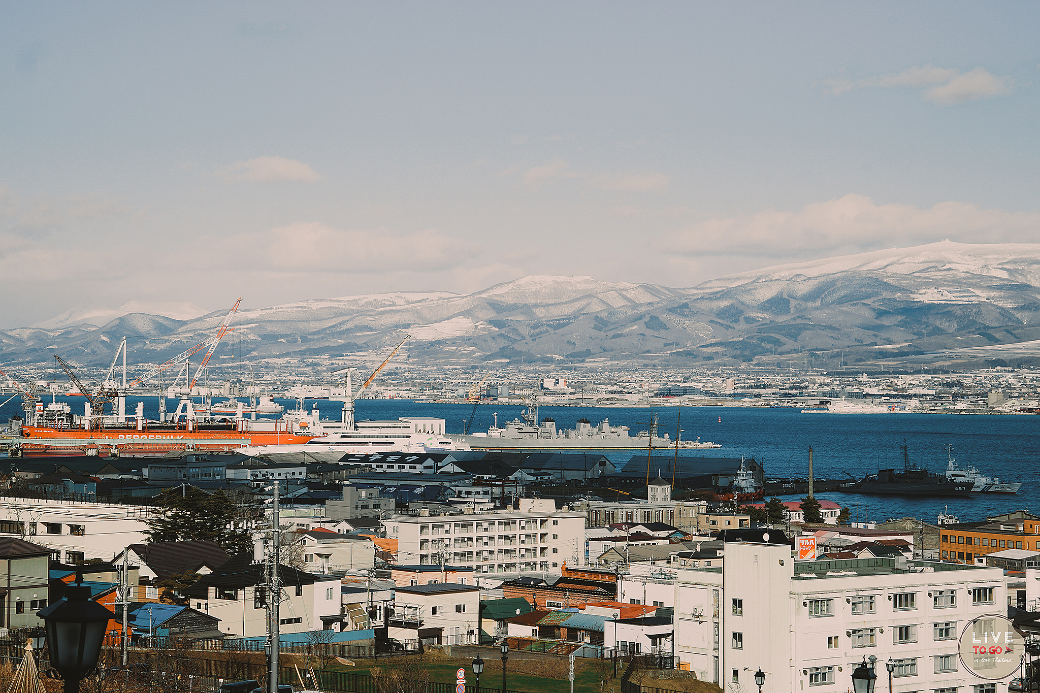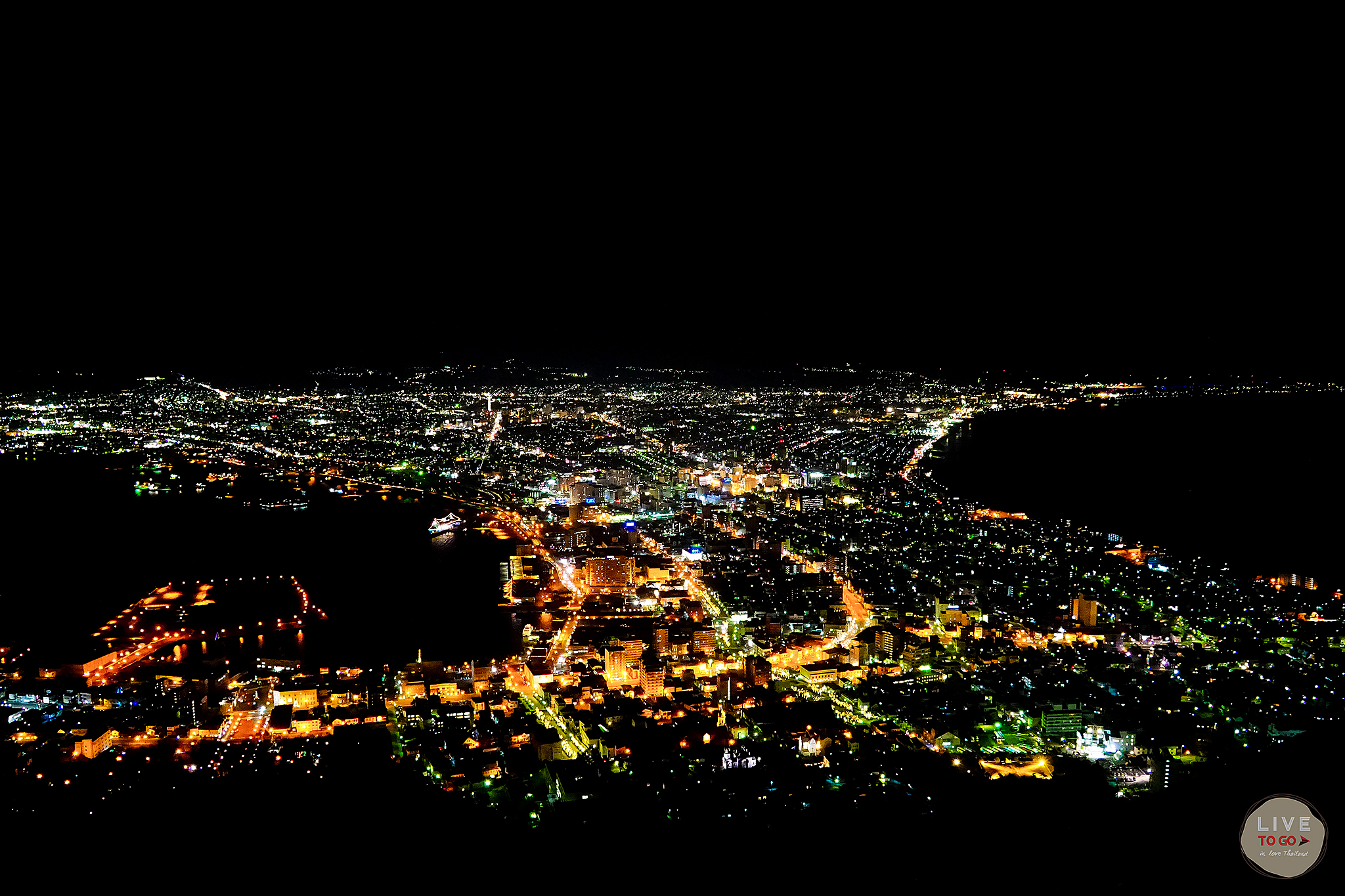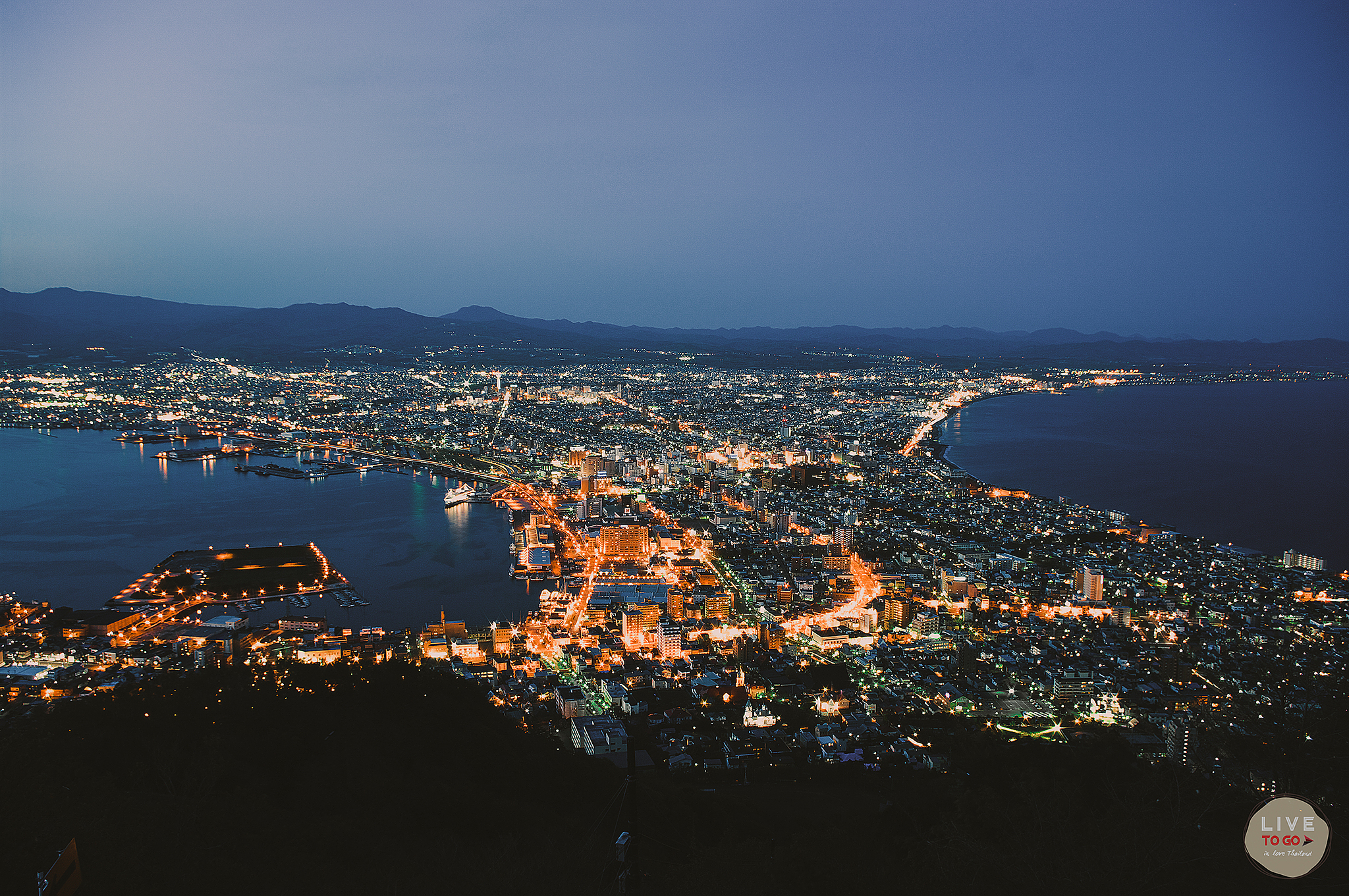 ขึ้นมาแล้วคุ้มจริงๆ เห็นเมืองฮาโกดาเตะ ได้ทั้งเมือง สังเกตดีๆ เมืองที่ถูกประกบด้วยน้ำทะเลสีฟ้าเข้มทั้งสองด้าน จนทำให้ดูเหมือนเป็นรูปนาฬิกาทรายขนาดใหญ่เลย ฟ้ามืดเร็วมาก แต่นักท่องเที่ยวก็มากันเยอะ ต้องรอคิวถ่ายรูปพอสมควร แถมอากาศเย็นมากๆ
