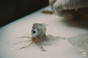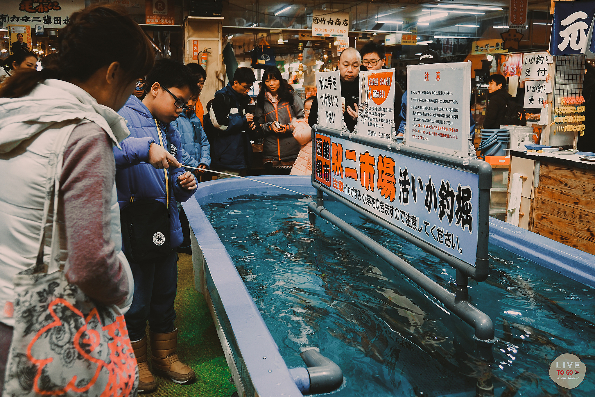 มันคือ บ่อตกปลาหมึกด้วยตัวเองเพื่อนำมาปรุงเป็นอาหารนั่นเอง ตลาดเช้าแห่งนี้ได้คิดไอเดียขึ้นมาเพื่อการนี้โดยเฉพาะ เพียงแค่ให้ไม้หนึ่งอันที่มีเบ็ดเกี่ยวอยู่ตรงปลาย แล้วก็ทดสอบฝีมือกันเลย เมื่อใครจับได้แล้ว เชฟจะเอาปลาหมึกนั้นมาทำ ซาชิมิปลาหมึกให้กินกันสุดๆไปเลย ราคาประมาณ พันกว่าเยน แต่ถูกอกถูกใจนักเที่ยวโดยเฉพาะชอบจีน แต่งานนี้เราขอชมเฉยๆพอ