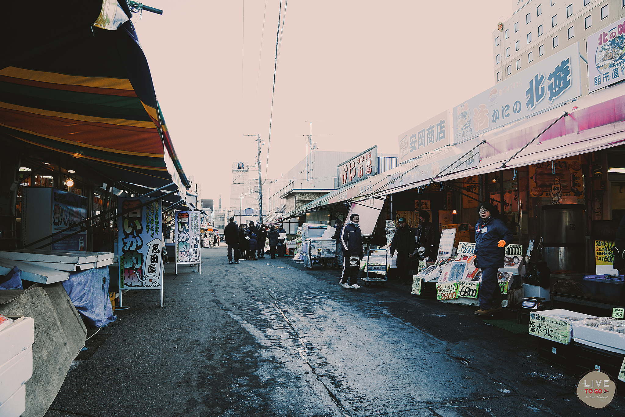 การเริ่มการท่องเที่ยวตั้งแต่เช้าตรู่ เราเดินทางในช่วงเดือนธันวาคม สภาพอากาศต้องบอกเลยว่าหนาวแต่โชคดีที่มีแสงแดดออกเป็นระยะๆ ที่พักอยู่ใกล้กับตลาดเช้าเลยเดินไปหาอาหารเช้ากินกันที่ ตลาดเช้าฮาโกดาเตะ